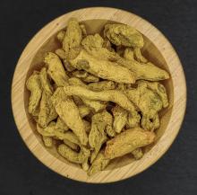 Turmeric has a bright yellow-orange color and a warm, slightly bitter flavor. It is used in many dishes, including Indian curries, rice dishes, and soups, and is one of the main ingredients in spice blends like curry powder and yellow mustard.